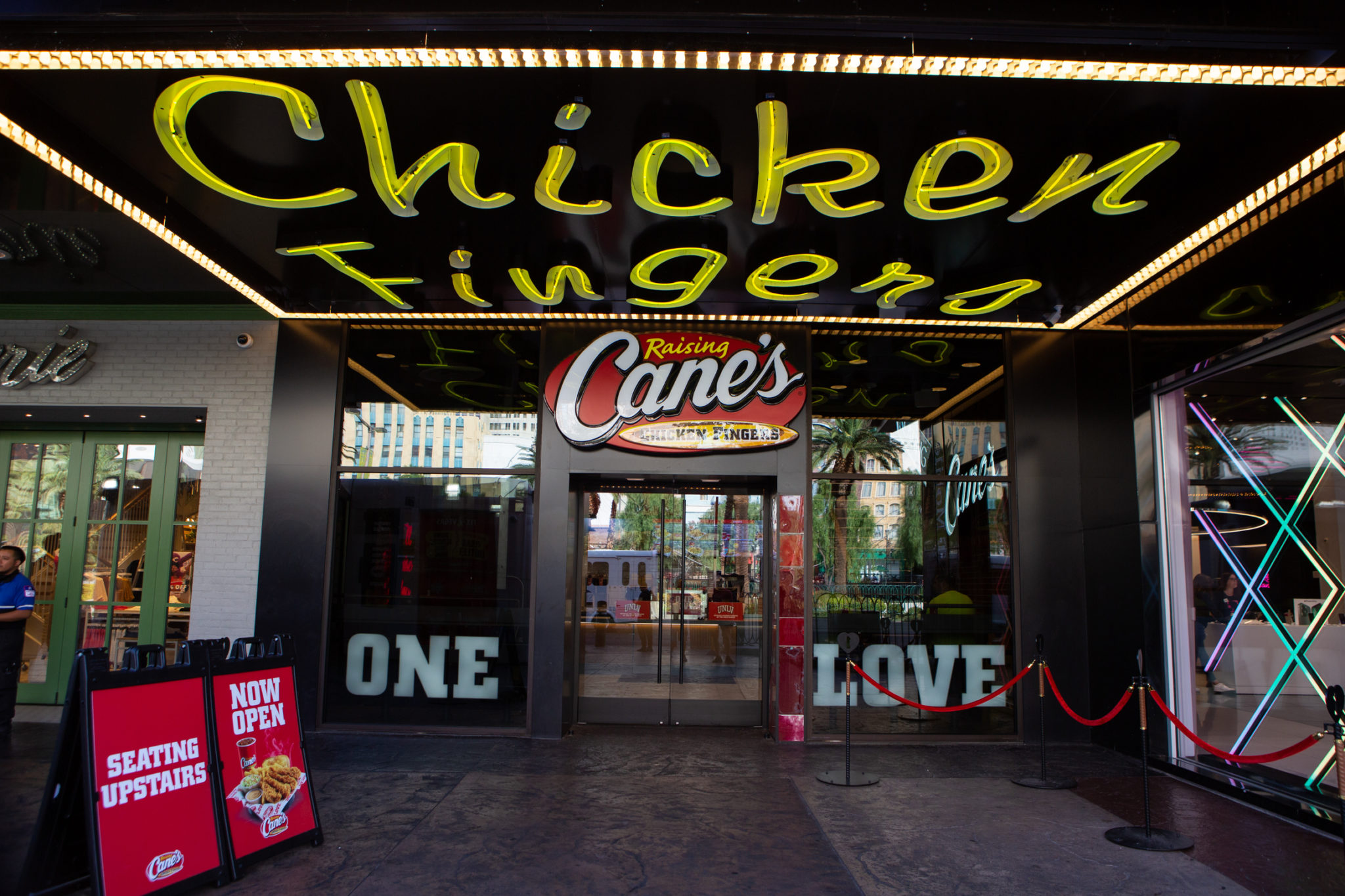 Raising Cane’s Chicken Fingers is an American fast-food restaurant featuring the best chicken fingers around. Come experience the neon lights and disco ball as you indulge in delicious fried chicken at the company’s first two-story location.